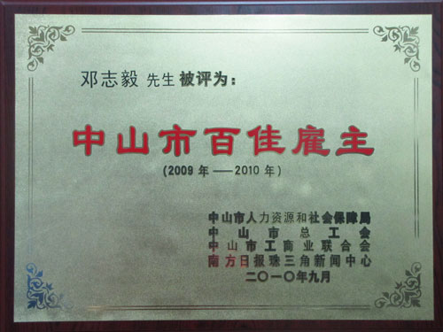 2010年9月13日下午2:00,中山市2010年度百佳雇主頒獎典禮暨“同是中山建設者”百佳流動務工人員評選活動啟動儀式在市文化藝術中心大劇場舉行。伴隨著現場近千名觀眾的熱烈掌聲,由中山市人力資源和社會保障局、中山市總工會、中山市工商聯以及南方日報珠三角新聞中心共同舉辦的“中山市首屆百佳雇主”評選結果正式揭曉,我司在眾多申報企業(yè)中脫穎而出,獲“中山市首屆百佳雇主”殊榮。