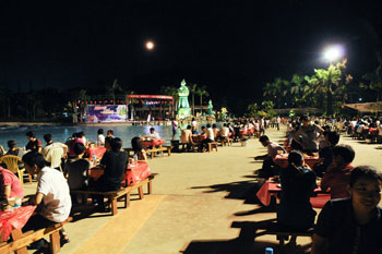 活動當日,長江水世界流光溢彩、歌聲飛揚。在造浪池沙灘旁,圓月當空、濤聲拍岸,領導與員工濟濟一堂,共仰明月,齊享美食,并不時走動暢談。公司為到場的所有員工和家屬提供了豐盛的應節(jié)食品,包括各式月餅、爽滑雞粥、濕炒河粉、新鮮水果、芋頭、菱角等,現(xiàn)場氣氛和美,其樂融融,讓員工真正感受到了金馬“家”的溫暖貼心。