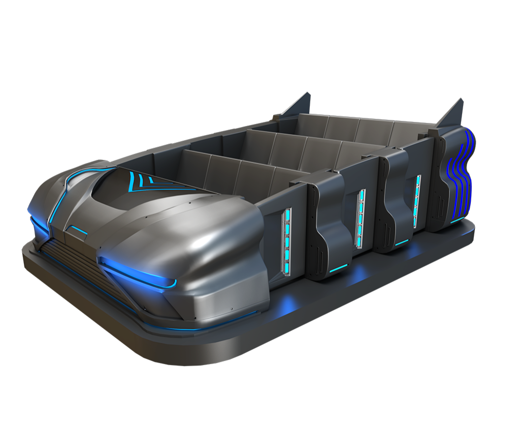 車體設計上,車輛結構輕巧、緊湊(承載人數(shù)12人/車),行走軌跡可隨意設定,且轉彎半徑小,可實現(xiàn)直角轉彎;車輛外觀富有科技感的配色及戰(zhàn)船造型,搭配炫彩的科技藍燈帶,貼合項目主題,營造滿滿的沉浸式科技氛圍。