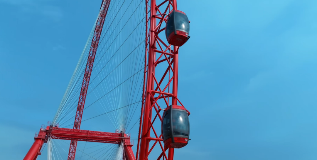 值得關注的是,金馬游樂在該項目上應用了兩項創(chuàng)新技術方案,確保摩天輪的舒適及安全。吊廂伺服調(diào)平技術,令每個吊廂在運行中始終處于水平狀態(tài),大幅提升吊掛式轎廂受到風載荷時的平穩(wěn)性;雙驅動系統(tǒng)獨立運作方案,增強安全冗余,緊急狀況下無高空救援風險。