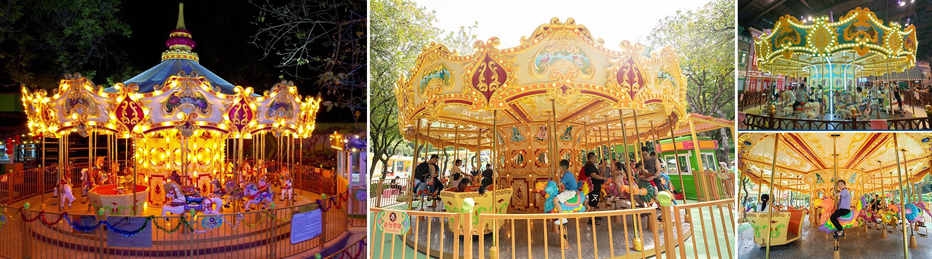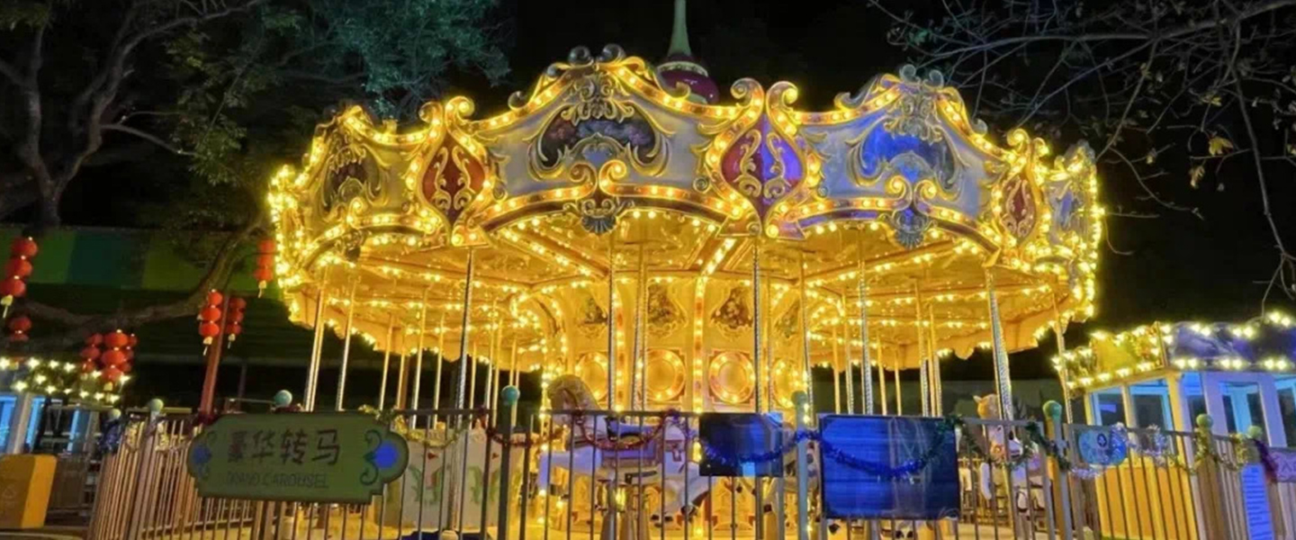 豪華轉(zhuǎn)馬采用歐洲皇家古典豪華的裝飾風格,頂棚華麗,內(nèi)外圍板鑲嵌著彩色浮雕和絢爛彩燈,馬匹及宮庭式馬車結(jié)合多彩的花飾,造型精致小巧。
