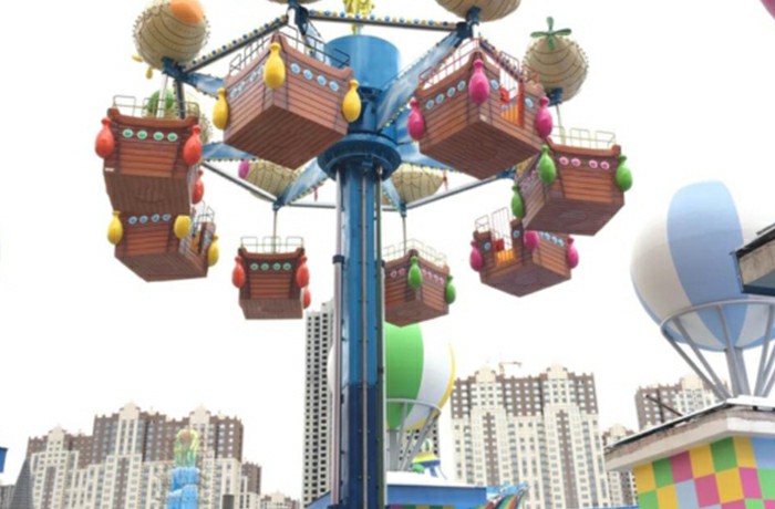 集旋轉(zhuǎn)、升降運動形式于一體的自控飛機類游藝機。逍遙塔是一款適合家庭游玩的游樂設(shè)備。設(shè)備啟動后,座艙在升降運動的同時繞立柱中心軸旋轉(zhuǎn),同時座艙還可以自由旋轉(zhuǎn),運動過程乘客可以體驗到乘坐游玩的樂趣。