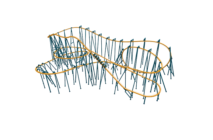 飛行姿態(tài)乘坐式過山車。軌道元素含括急速俯沖飛行、大俯沖飛行、卷餅形倒栽環(huán)、水平環(huán)等,滑行中乘客在軌面仰姿和軌下俯姿兩種姿態(tài)間連續(xù)切換,領(lǐng)略高空翱翔的刺激。與以往的飛行過山車不同,此款飛行過山車車體位于軌道上方,配合水平面上下客平臺,改善了乘客臥姿上下的不適與不便,有效提升舒適度與運(yùn)營效率。