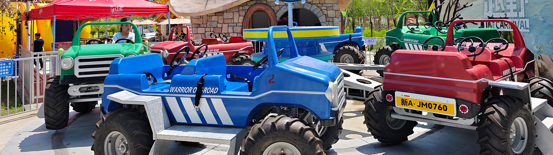 勇?越野?,以越野?為主題,?體繞中?旋轉(zhuǎn),同時在路軌上設(shè)有兩個障礙坡。通過坡道產(chǎn)?短暫的懸空狀態(tài),讓游客體驗?躍的感覺。整體包裝設(shè)計采?越野?狂野的造型,巨?的輪胎加以?屬質(zhì)感的?殼,仿佛西部?仔馳騁于?壁,體驗狂野的感覺,深受?童/親?游客的喜愛。