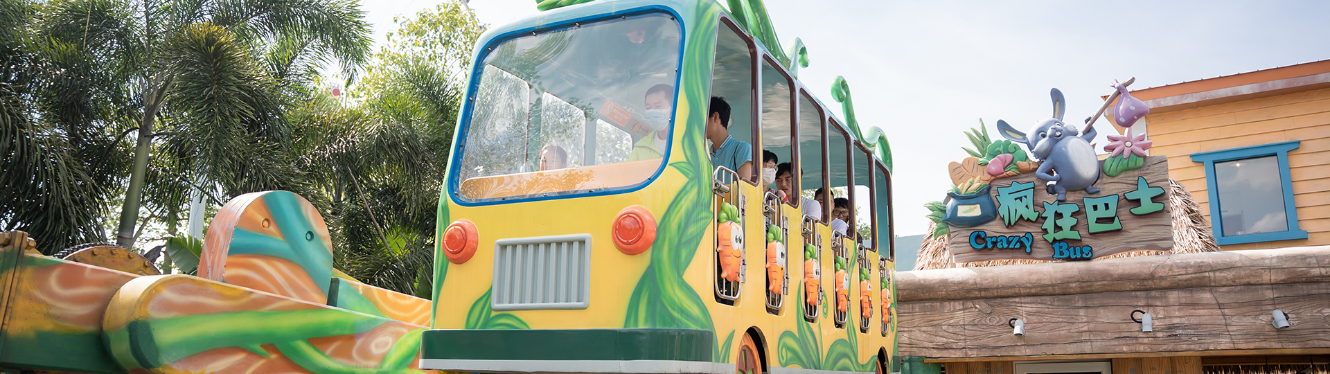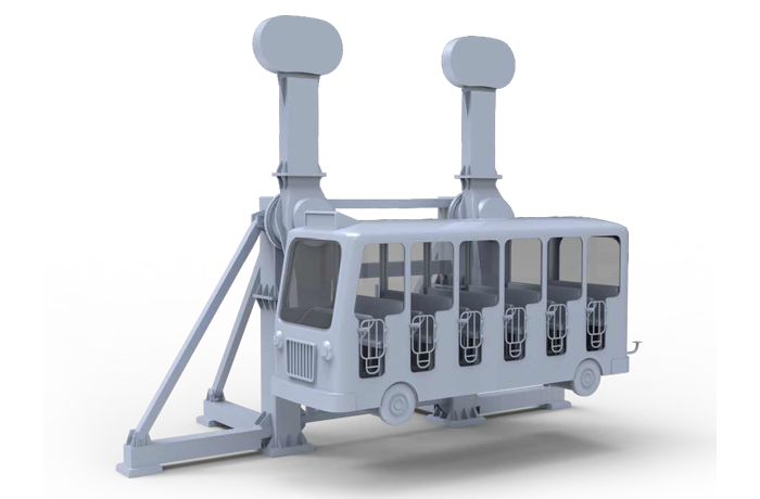 瘋狂巴士配備雙向可逆無(wú)級(jí)自動(dòng)調(diào)速系統(tǒng),經(jīng)過(guò)減速、分速等一系列機(jī)構(gòu),實(shí)現(xiàn)一臺(tái)電機(jī)帶動(dòng)兩個(gè)驅(qū)動(dòng)臂的擺動(dòng),帶動(dòng)巴士的平動(dòng),巴士在電氣系統(tǒng)的控制下可以實(shí)現(xiàn)正反兩種通過(guò)最高點(diǎn)的運(yùn)動(dòng),給乘客以歡樂搖擺的體驗(yàn)。