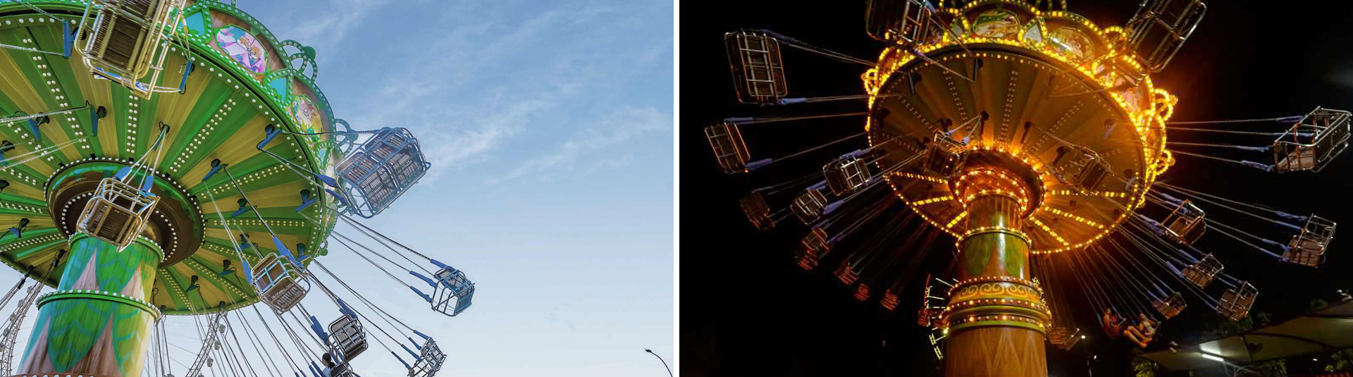 颶風(fēng)飛椅設(shè)備通過傘形轉(zhuǎn)盤的旋轉(zhuǎn)和中間轉(zhuǎn)臺的錯位旋轉(zhuǎn),實(shí)現(xiàn)飛椅的波浪式運(yùn)動,乘客猶如在空中自由飛翔飄蕩。此款飛椅設(shè)有2人座艙,適合家庭親?或情侶游客游玩。