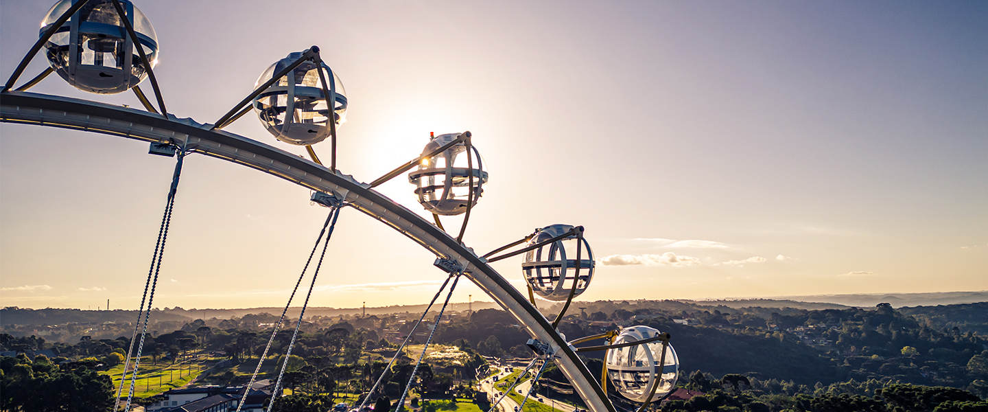 觀覽?塔架采?新穎的4?柱?橫梁極簡結構,搭配單管輻條式轉盤和圓球艙,整體姿態(tài)盡顯現(xiàn)代簡約之美。觀覽??轉盤上均勻分布著30個?珠般的圓球吊廂,單管輻條式設計令艙內觀景視野開闊通透,可供180?觀光。在夜間滿環(huán)律動的燈光能瞬間點燃夜場?氛推?觀覽激情。