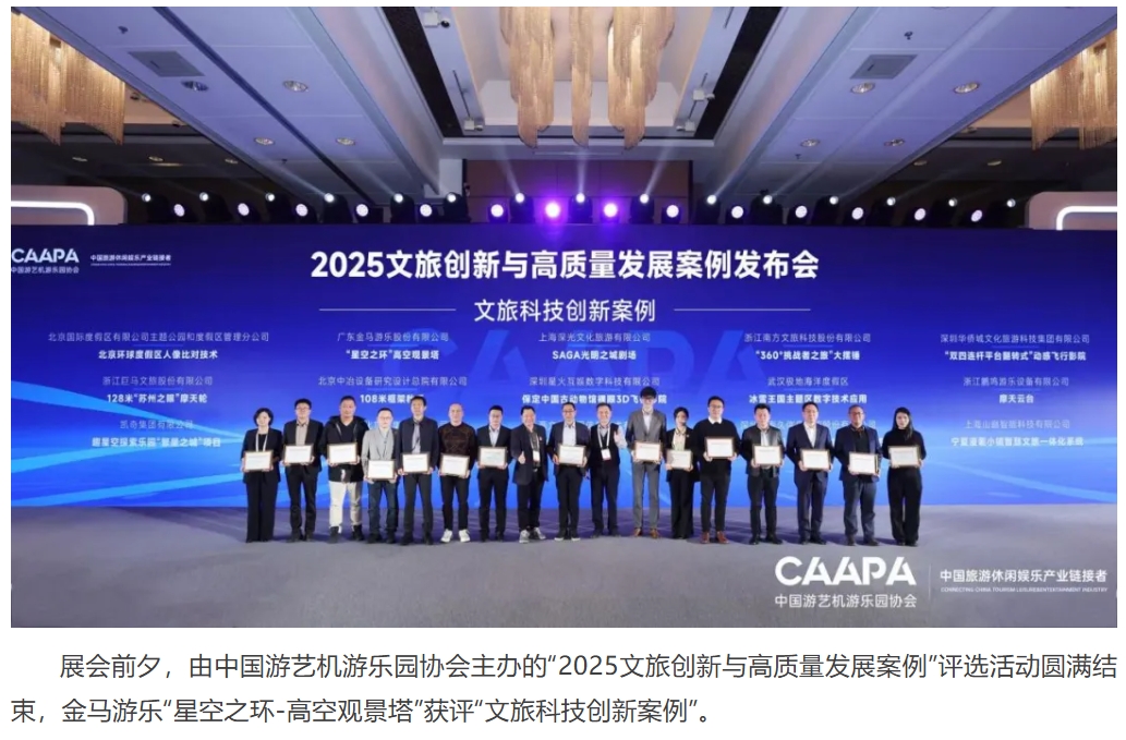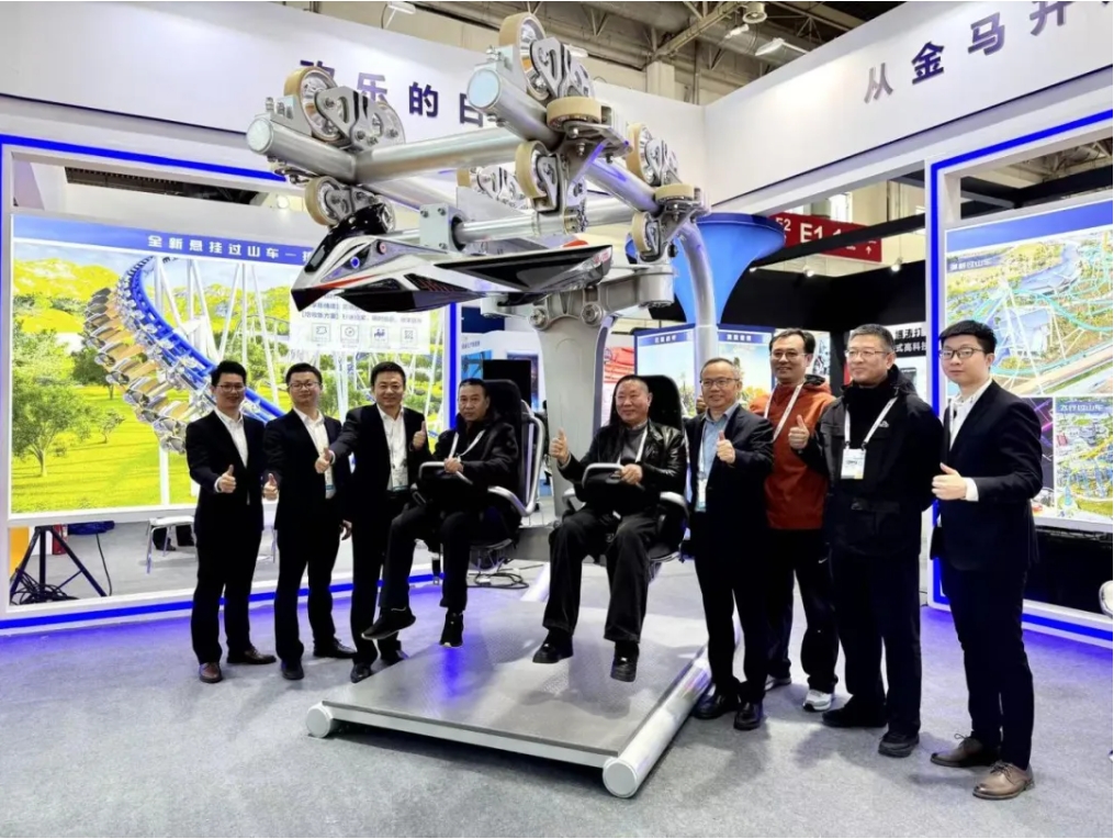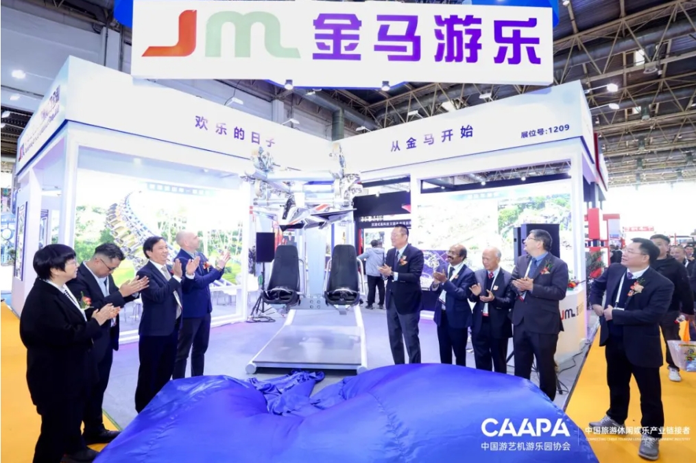 3月19日,2025 CAAPA北京展盛大開幕,展會首日,金馬游樂舉辦了主題為“革新體驗(yàn),領(lǐng)航未來”的新品揭幕活動,為全新懸掛過山車“掠空者”揭開神秘面紗。活動現(xiàn)場人頭攢動,氣氛熱烈,中國游藝機(jī)游樂園協(xié)會會長姚軍、副會長戎志剛、TEA(主題娛樂協(xié)會)董事會主席Matt Barton、印度游協(xié)會長VGP Ravidas等行業(yè)重要領(lǐng)導(dǎo)和嘉賓齊聚一堂,共同為這款過山車揭幕。他們的到來不僅為活動增添了光彩,也彰顯了金馬游樂在行業(yè)內(nèi)的強(qiáng)大影響力。